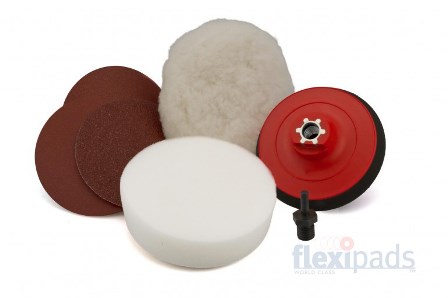Sada pro hobby leštění. Obsahuje podložný talíř o průměru 125 mm se závitem M14, adaptér z M14 na 6 mm stopku pro uchycení do vrtačky, bílou leštící houbu 125 mm, leštící kotouč z ovčí vlny 125 mm, 3 brusné kotoučky 125 mm (P60, P120, P180).